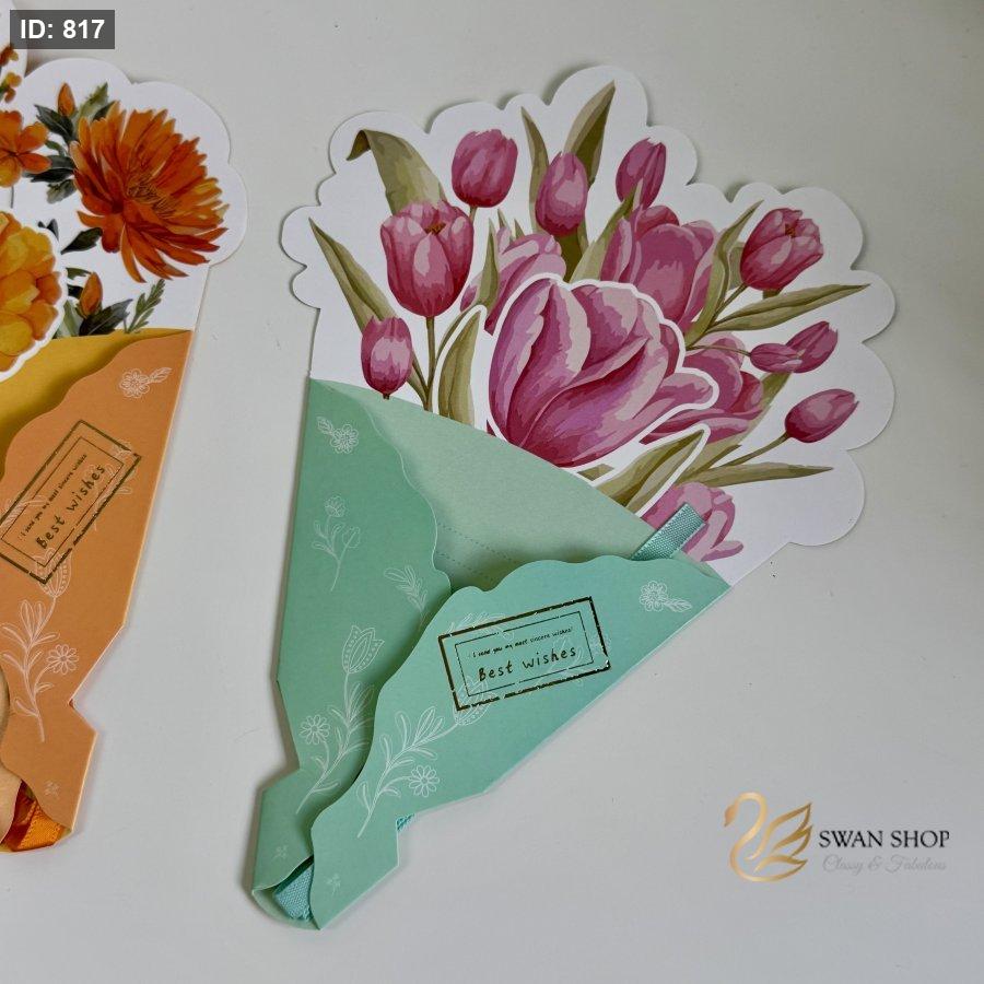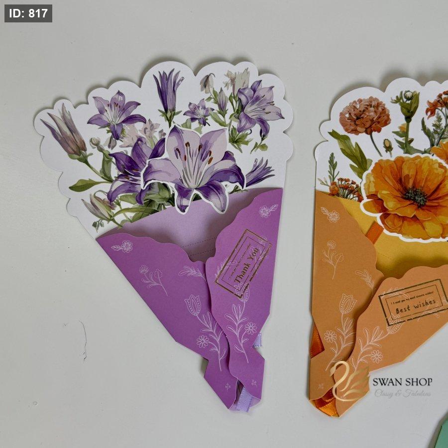 بطاقة معايدة بتصميم فريد يأخذ شكل بوكيه ورد أنيق، تضيف لمسة من الجمال والرقي على أي هدية.
