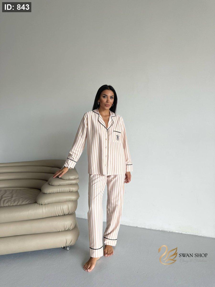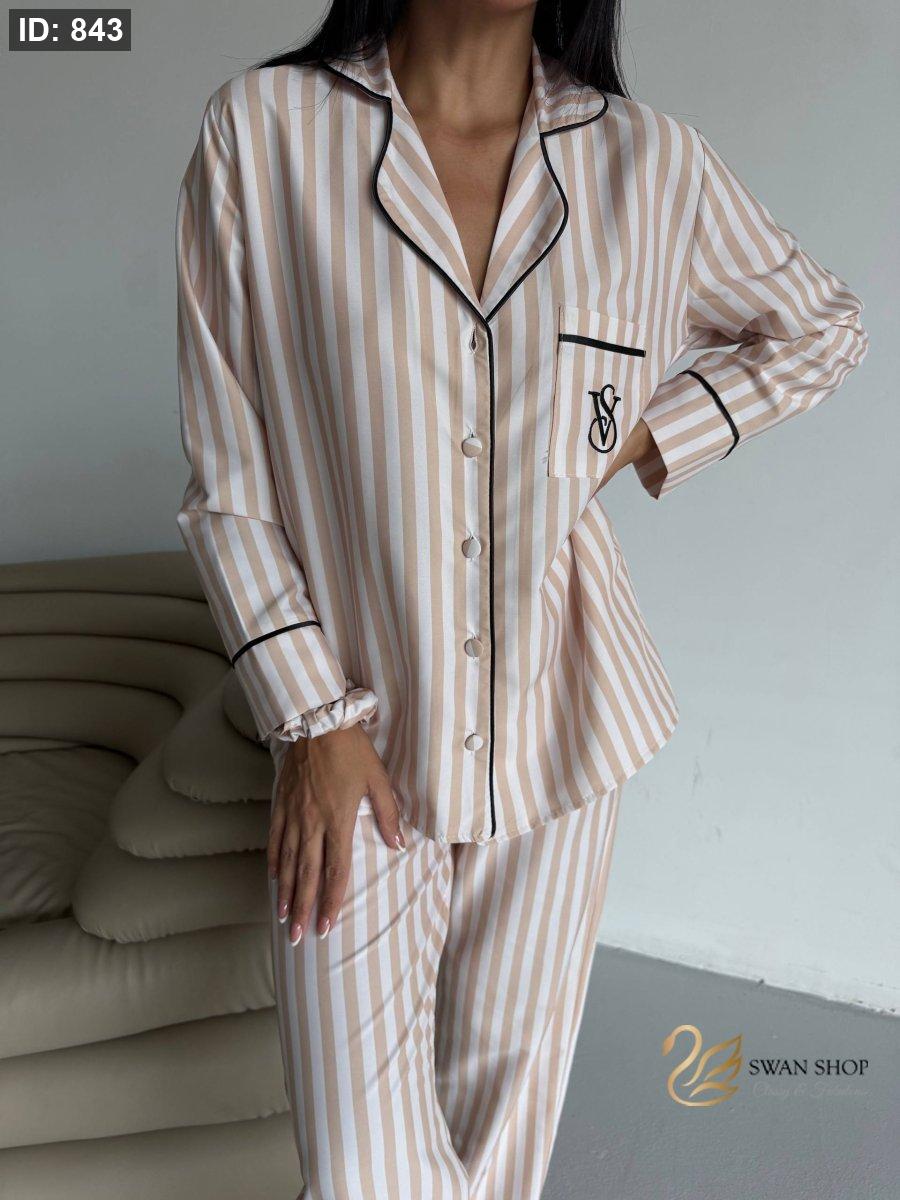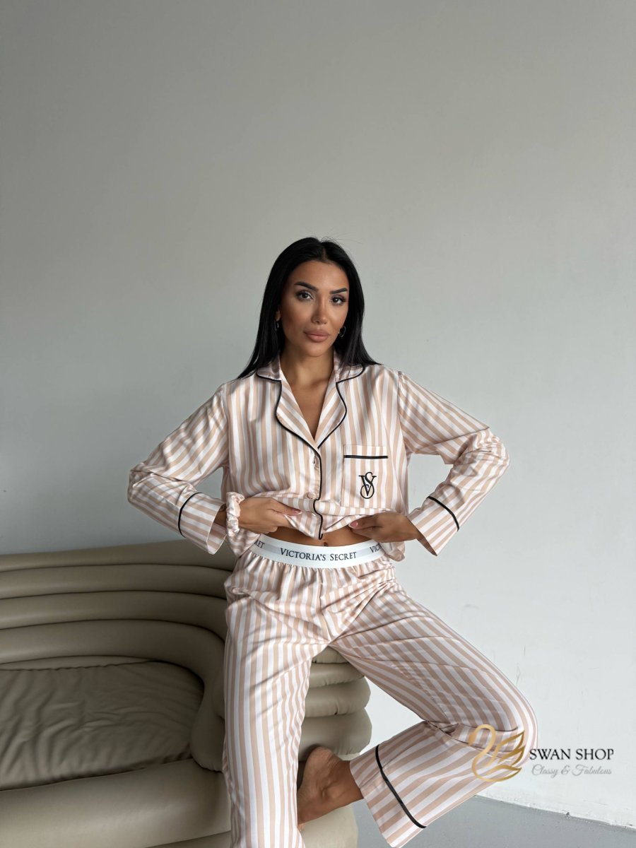 بجامة فيكتوريا سيكرت مقلمة بلون بيج