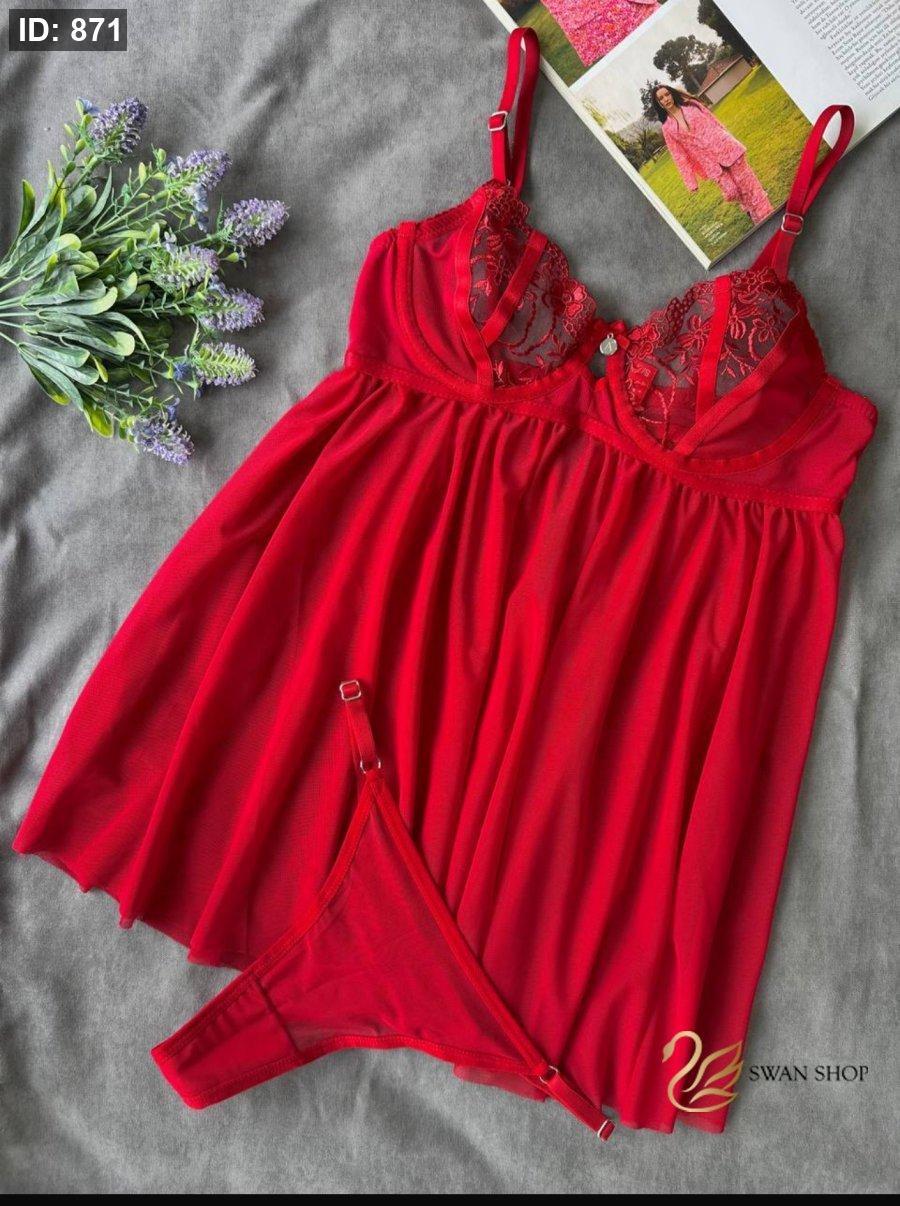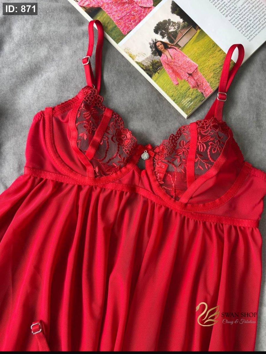 طقم لانجري مثير أحمر رائع بتفاصيل رومانسية على منطقة الصدر، مع قماش شبكي خفيف يمنحك إطلالة أنثوية ملفتة.